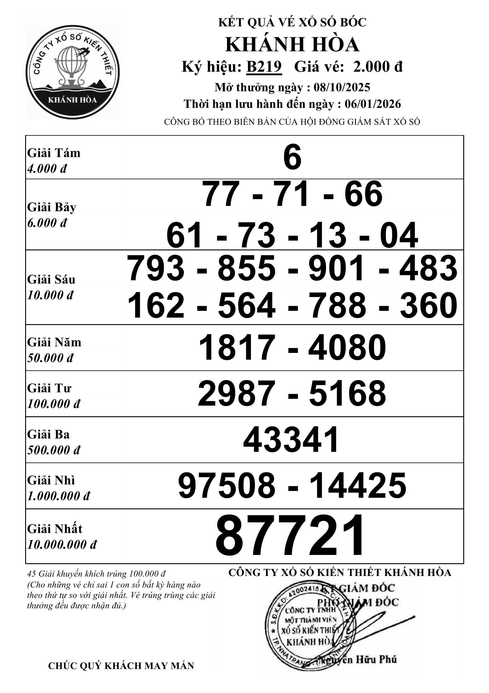 Ngày Mở Thưởng: 08-10-2025 28-09-2025 17-09-2025 10-09-2025 03-09-2025 27-08-2025 20-08-2025 13-08-2025 06-08-2025